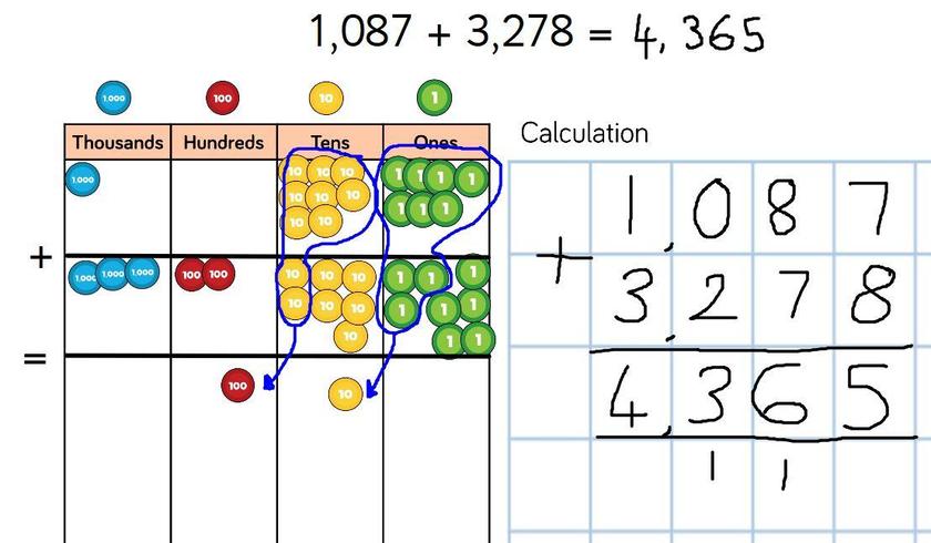 This week we have been learning all about column addition which is our Year 4 calculation method. The children have worked really hard and have enjoyed learning the new method! For homework, we would like children to complete the column addition activities on the sheet making sure that they show their method. There are exchanges in both levels as have been focussing on how to do this all week. Children - if you get stuck remember to go back to a pictorial representation to help you. Here's an example of how we have been doing it in school. Children only need to use the written calculation but can draw the pictorial representation if it helps them.
